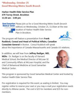 The Harbor Health Elder Service Plan (PACE) will be hosting the Good Morning Metro South Brunch this Wednesday October 25th at the new Brockton location. Please see the link below for more details and to register for the event.